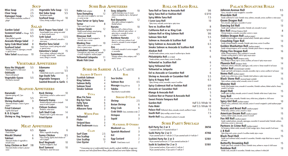 Introducing the menu at Palace of Japan, located in Bronx, NY, offers a delightful selection of Japanese cuisine. With a focus on seafood appetizers like BBQ Squid and Chilean Seabass broiled with miso sauce, the menu caters to seafood enthusiasts. For vegetarians, options like Agedashi Tofu and Vegetable Tempura are available. The beverage selection includes Japanese Soda and Fiji Water for a refreshing experience.